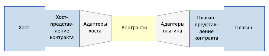 Основным элементом в MAF является контракт — это то, что определяет, как хост-приложение и плагин взаимодействуют друг с другом. Хост-приложение использует контракт в особом представлении для хост-приложения, а плагин — в особом представлении для плагина. Для обмена данными и вызова методов между хост-приложением и плагином через соответствующие представления контрактов используются адаптеры: